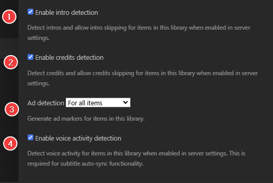 1. Generate intro detection for items in this library when enabled in server settings.